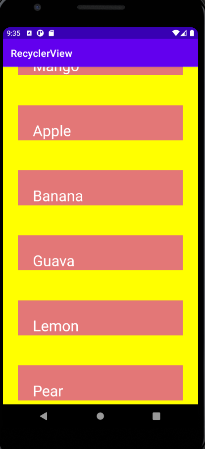 val fruitsList = listOf(Fruit("Mango","tom"),Fruit("Apple","jom"),Fruit("Banana","hom"),Fruit("Guava","jom"),Fruit("Lemon","kom"),Fruit("Pear","oom"),Fruit("Orange","koa"))